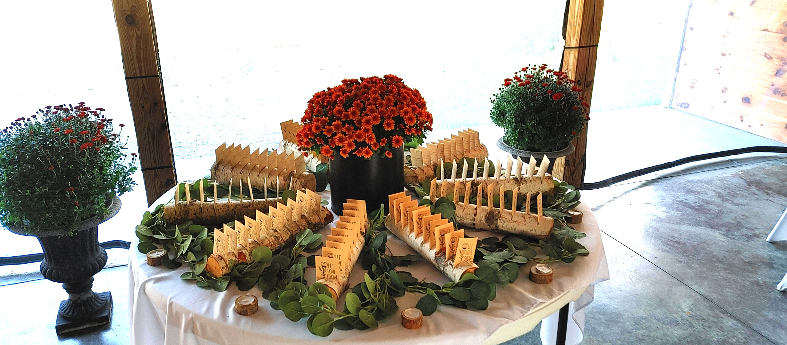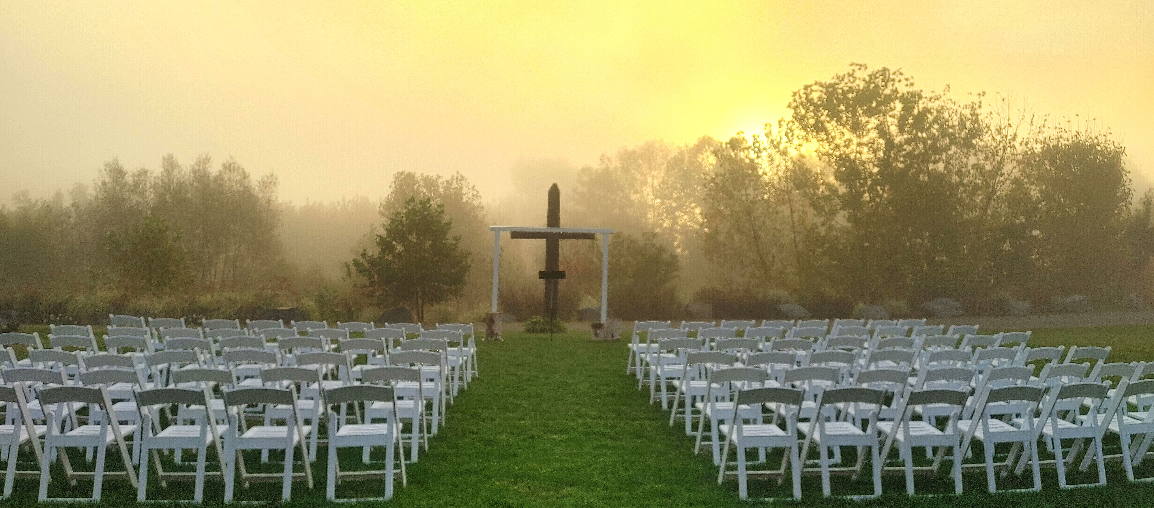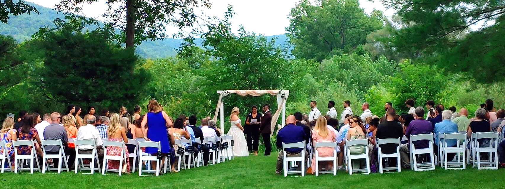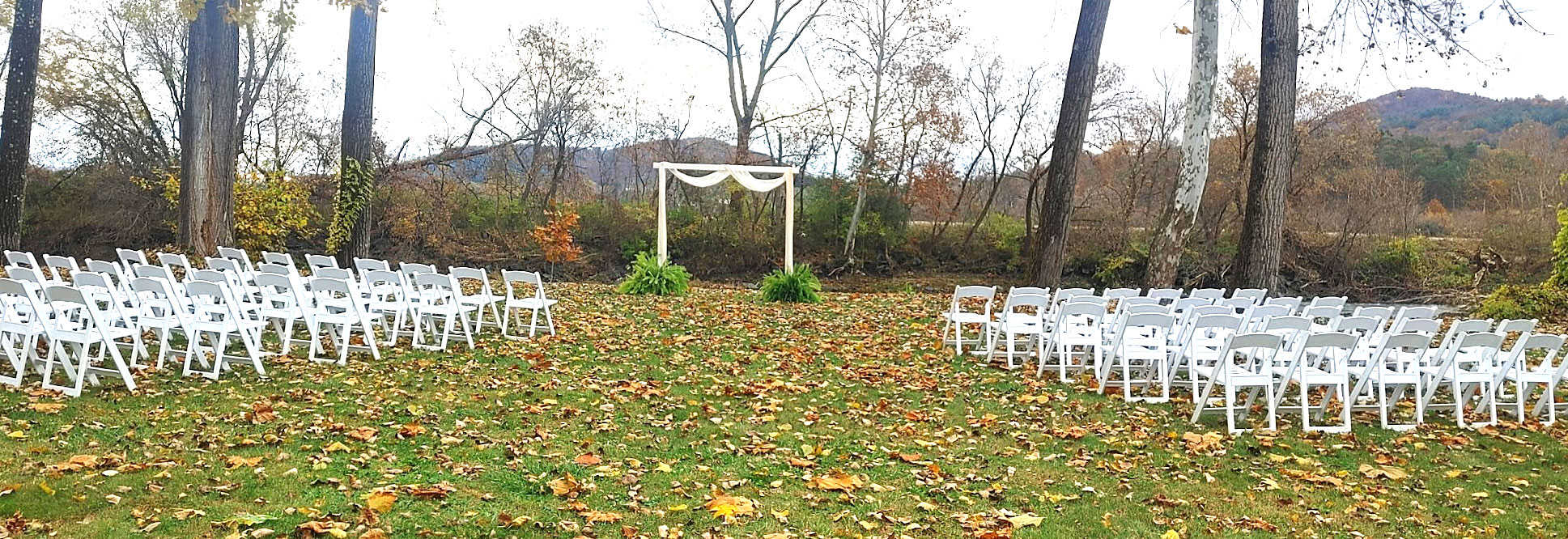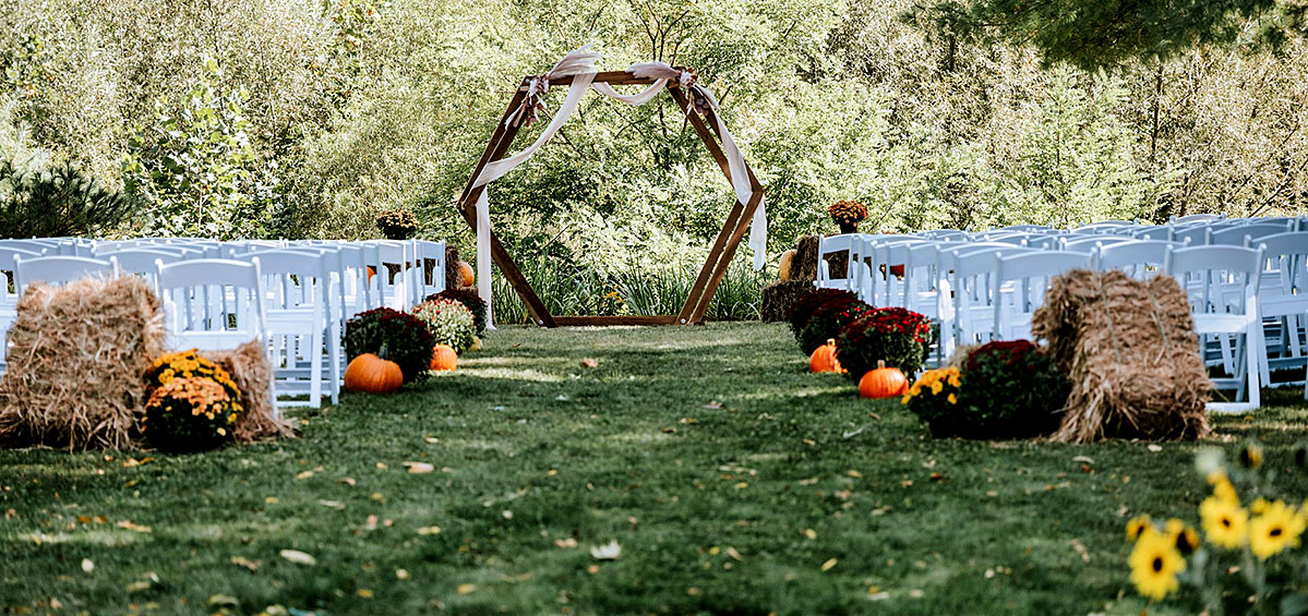 A spacious outdoor ceremony space framed by nature and romantic details