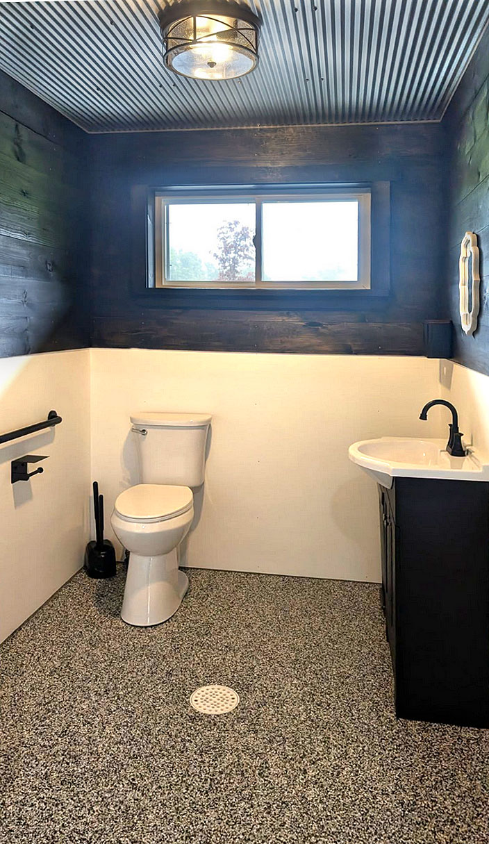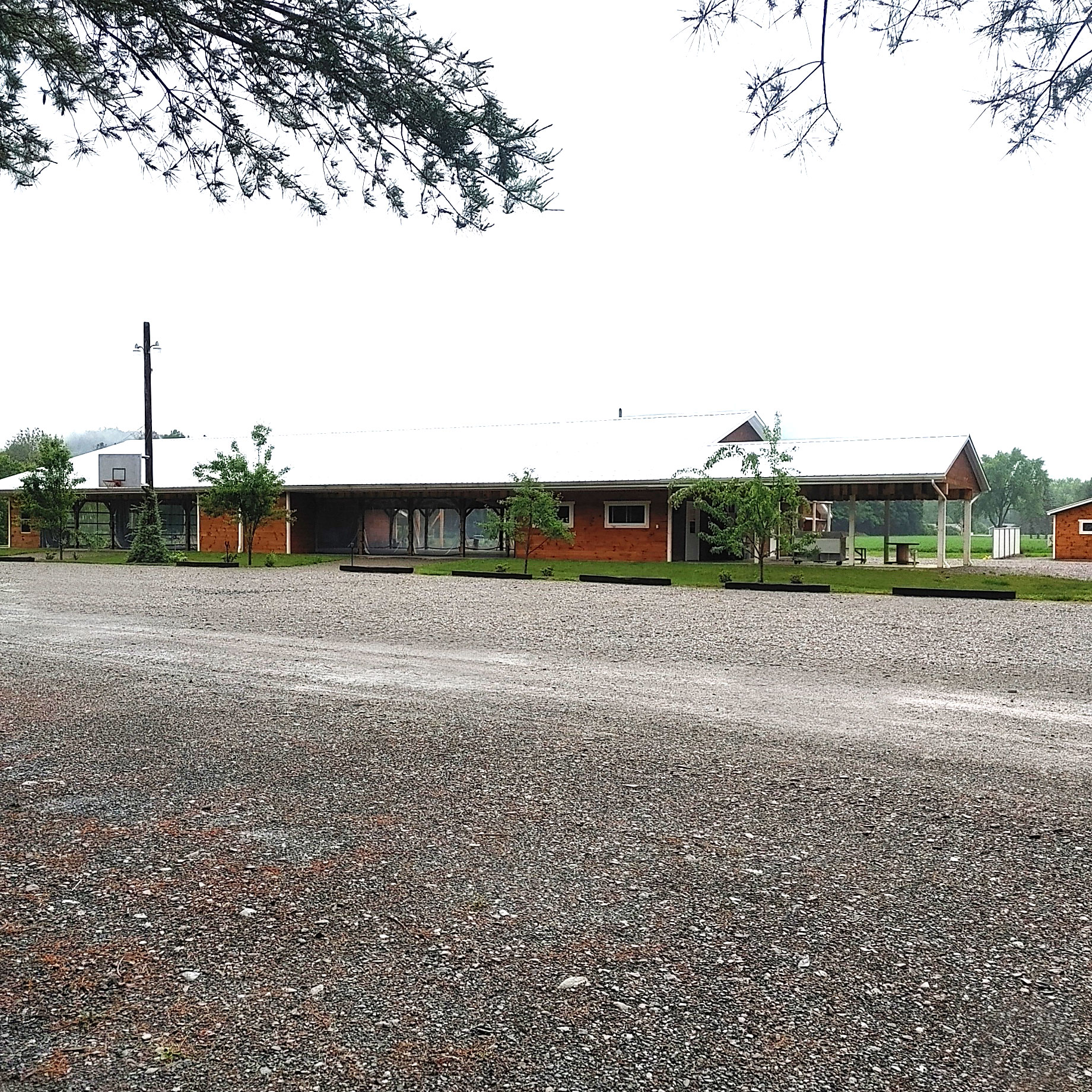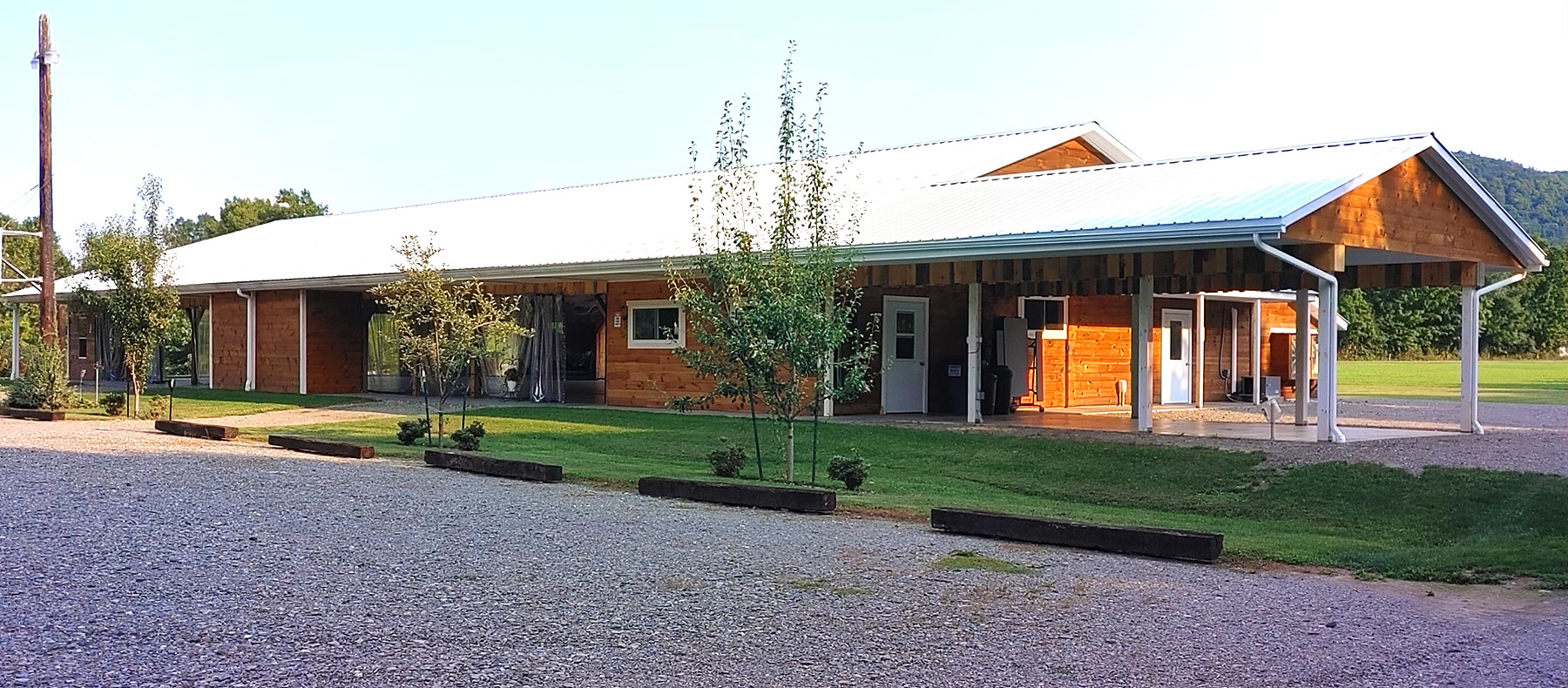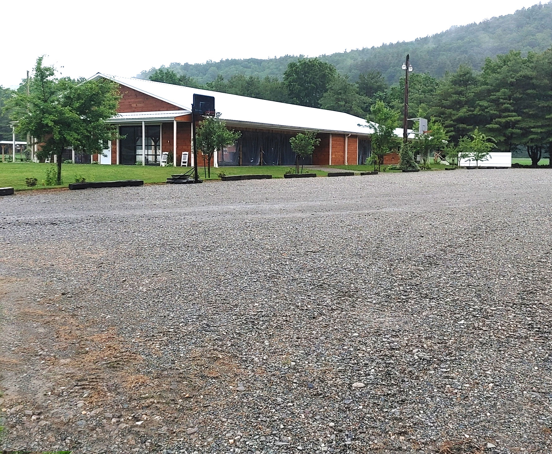 A large parking lot for guests which includes handicap parking and a smaller parking lot at the rear for vendor parking