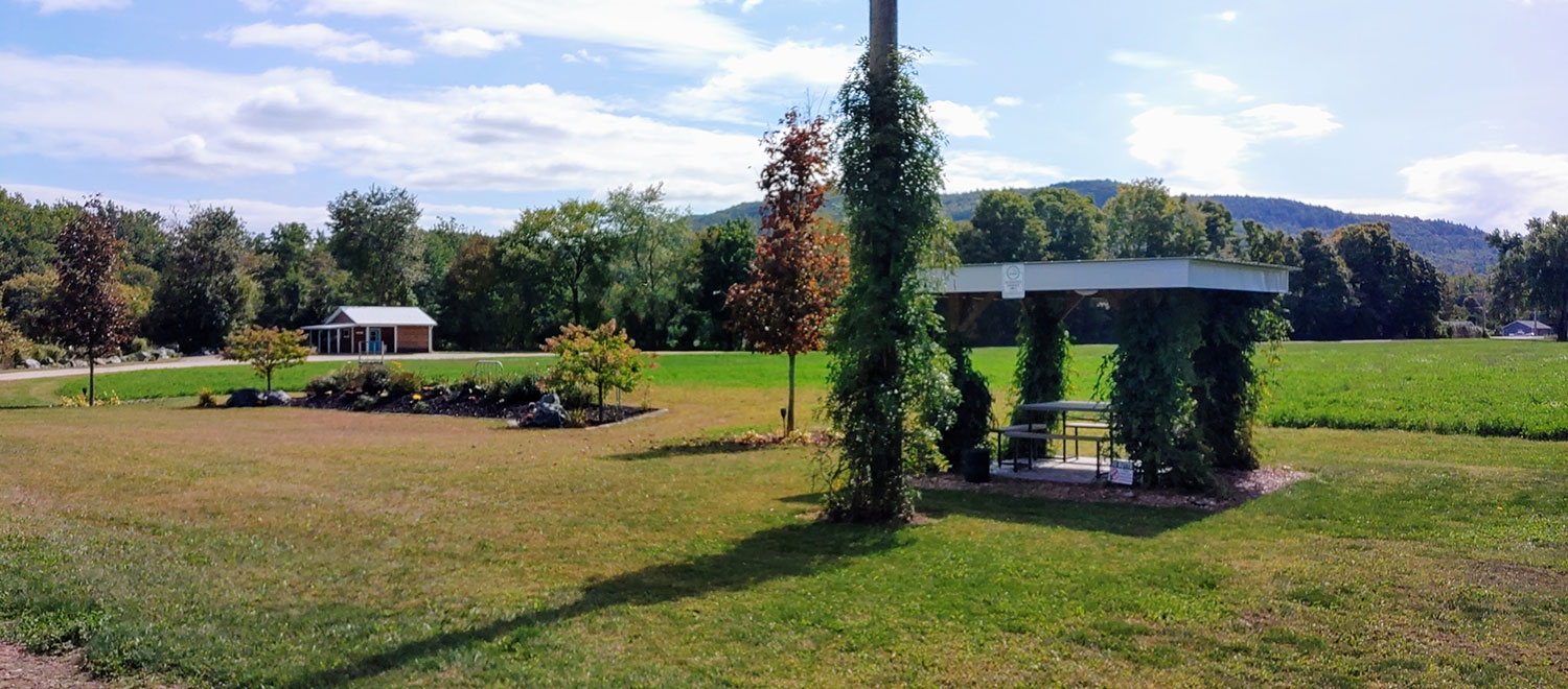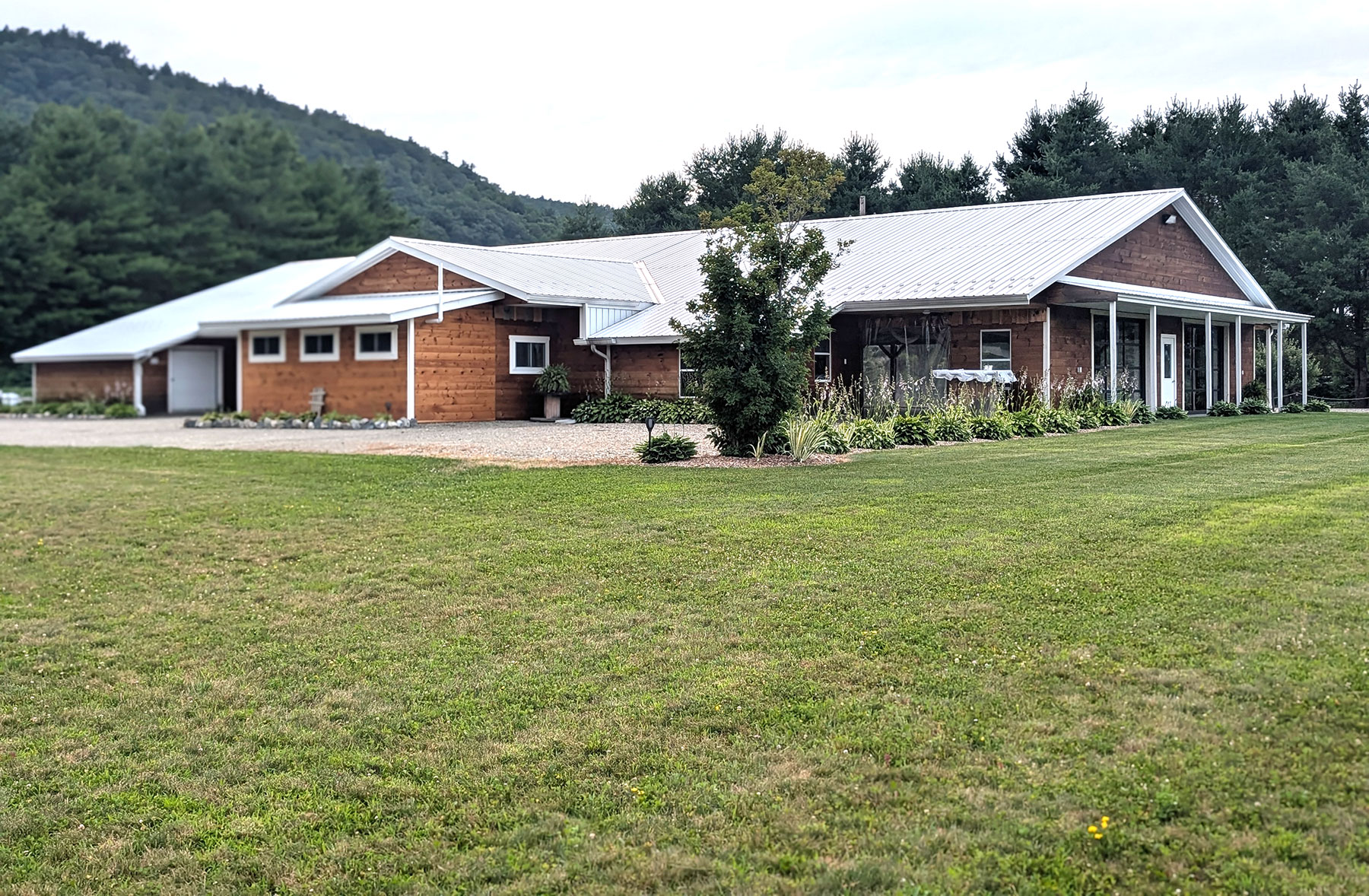 There is a large lawn area available for ceremony setup, outdoor games, family photos, etc. The area is landscaped with various perennial flowers, trees and shrubs.