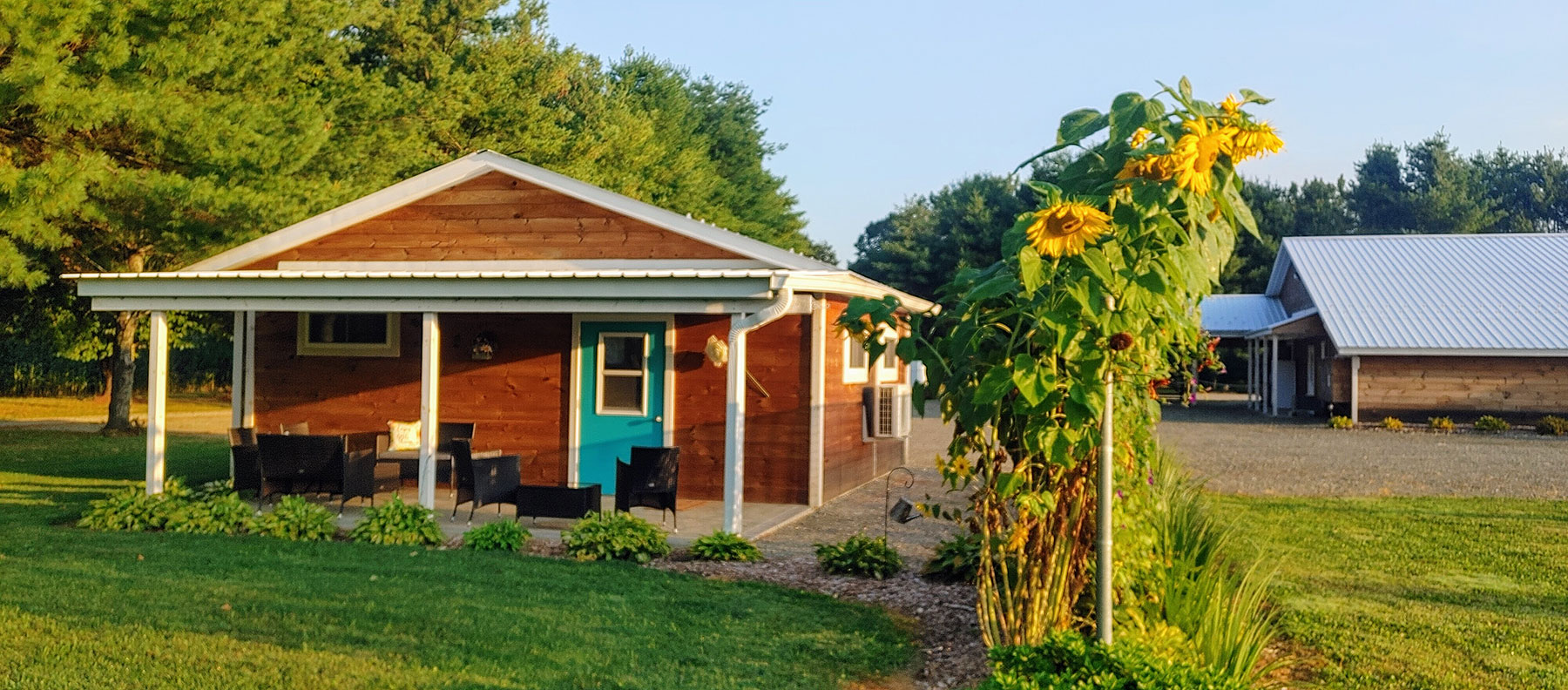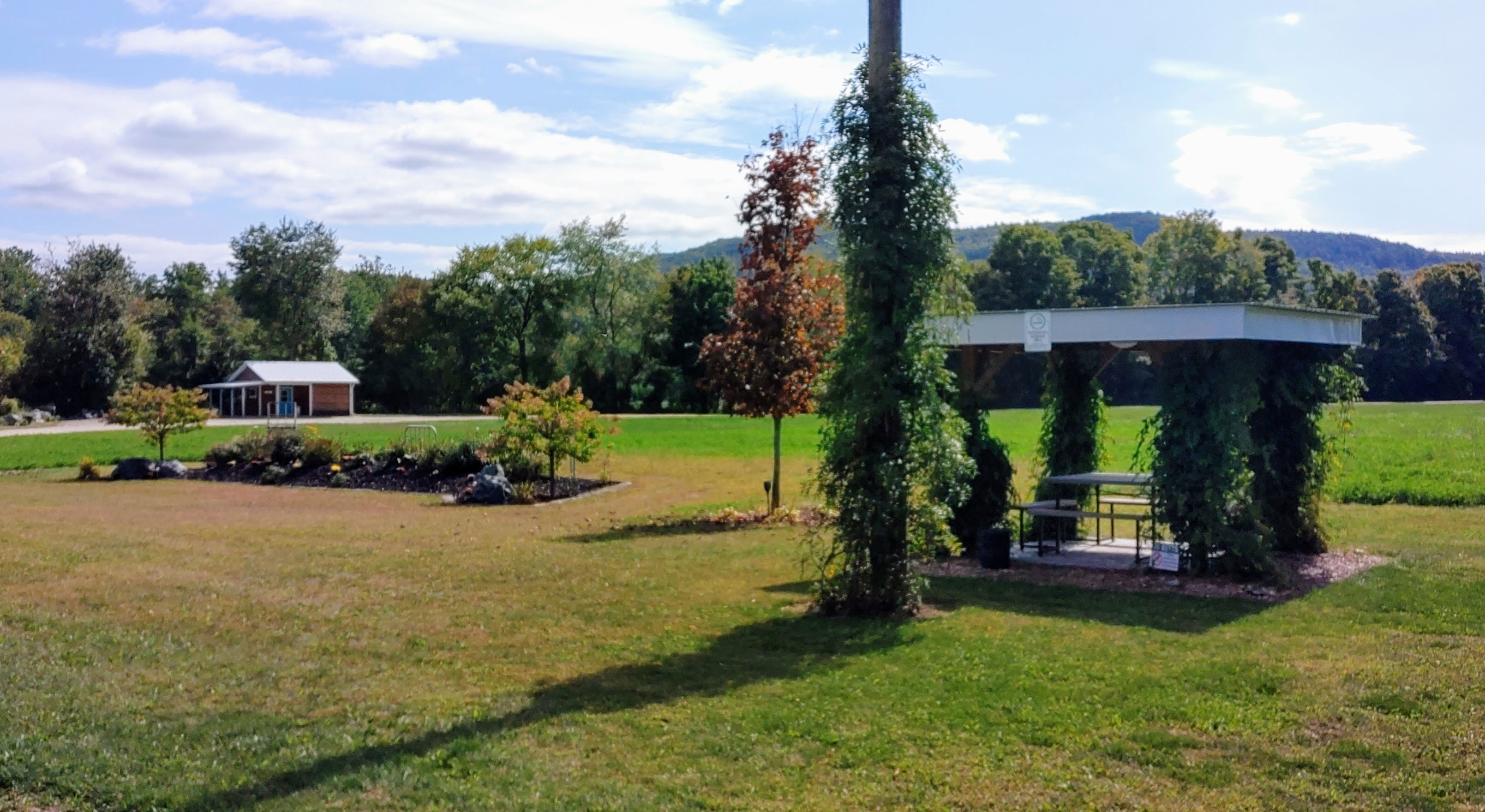 There is a large lawn area available for ceremony setup, outdoor games, family photos, etc. The area is landscaped with various perennial flowers, trees and shrubs.