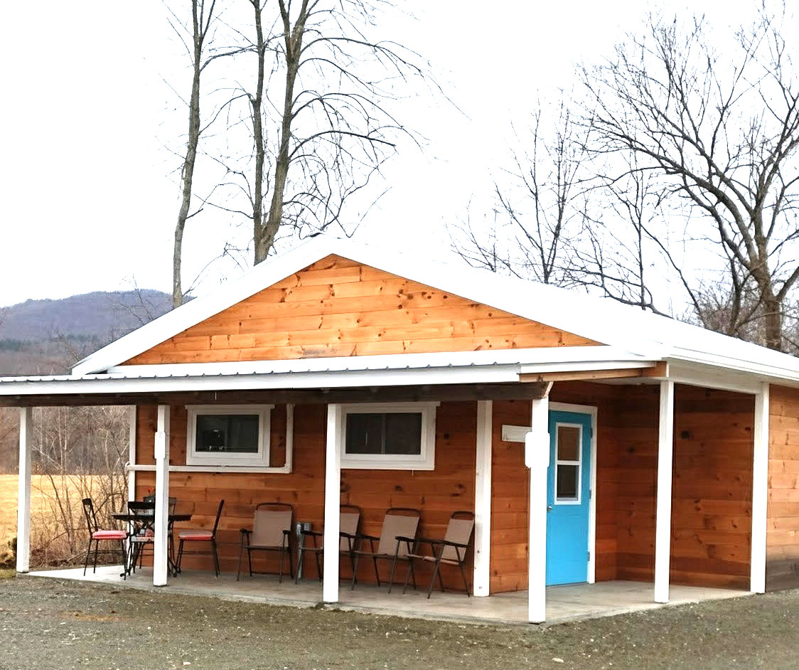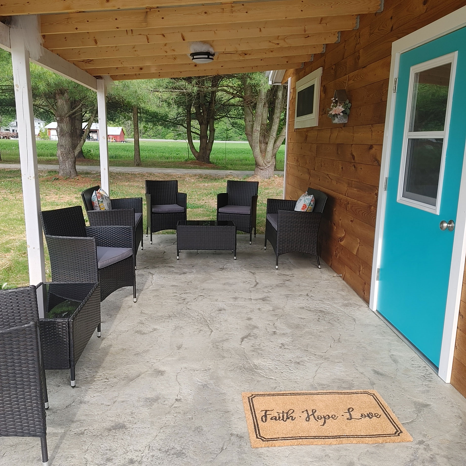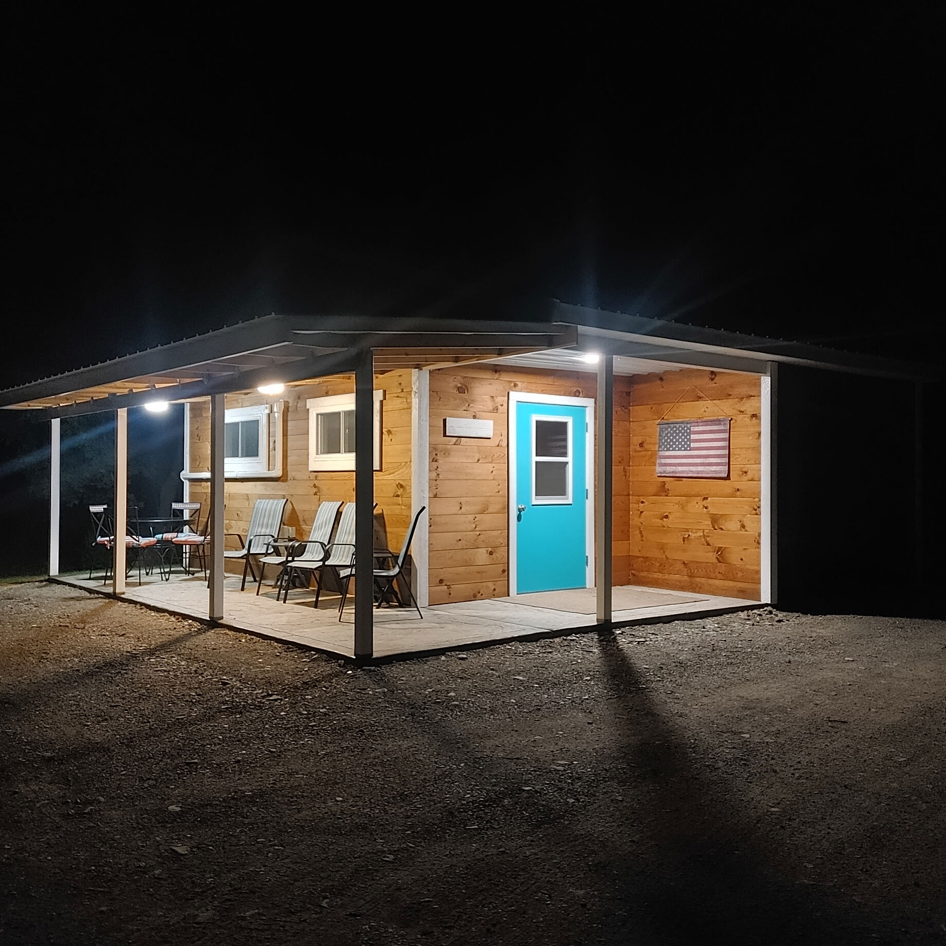 Covered smoking area with seating and lights.