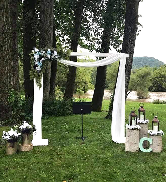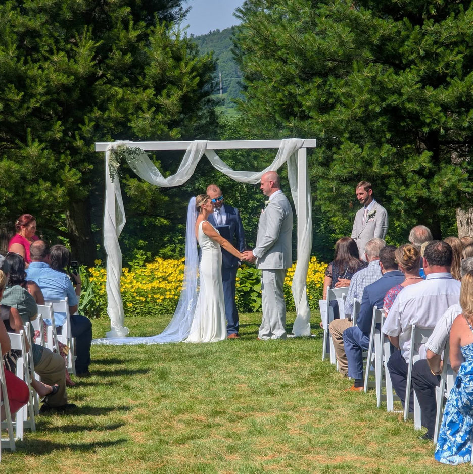 A spacious outdoor ceremony space framed by nature and romantic details
